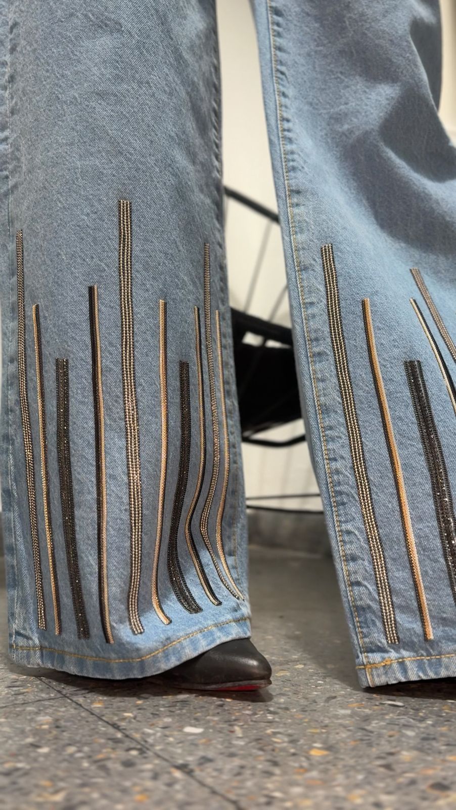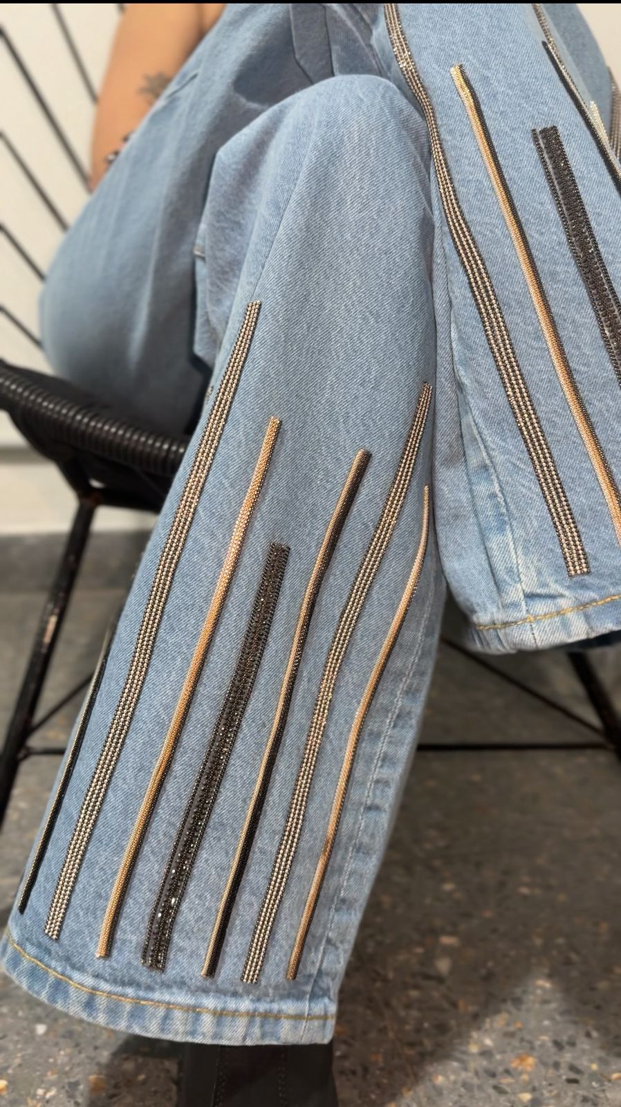 Jean de corte wide leg, tiro alto de tela rígida. Está intervenido y customizado a mano  en la parte de adelante.